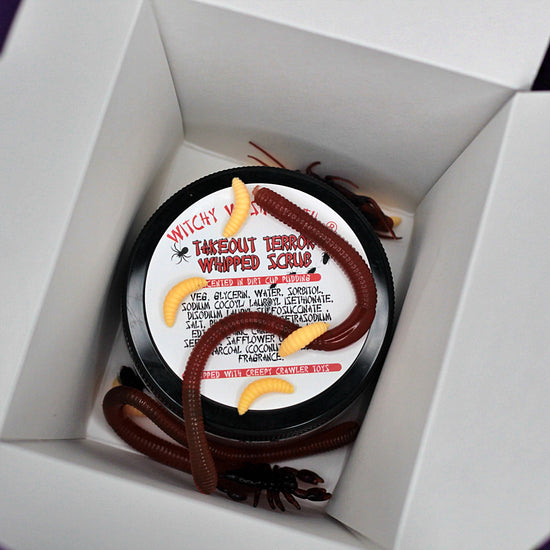 Something sinister is on the menu… This is our Takeout Terror Whipped Scrub 🥡 This 8oz dish is scented in Dirt Cup Pudding, infused with Activated Charcoal, and comes garnished with creepy crawlers for that extra crunch 🪱 Served to you fresh in a takeout box!